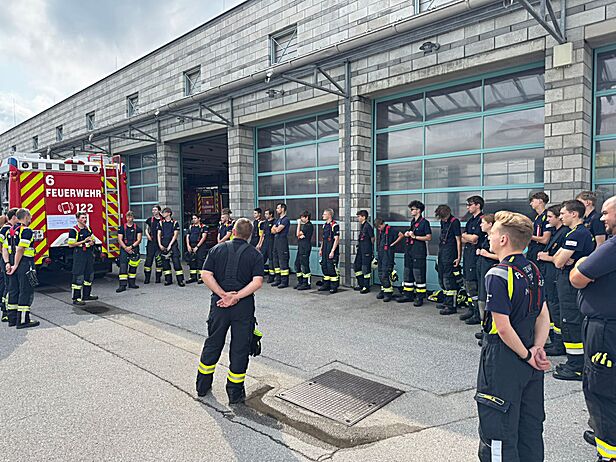 Thematik war auch das Herstellen einer Saug- und Angriffsleitung. In Kleingruppen ist die Einteilung der Fahrzeugmannschaft in die jeweiligen Trupps besprochen und anschließend praktisch umgesetzt worden. Bei der Station "Verhalten in der Gruppe" wurde den Teilnehmenden das Kommandieren einer Gruppe näher gebracht.