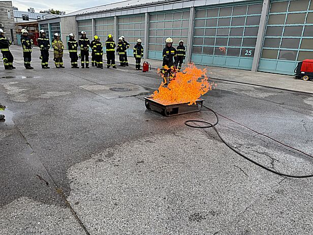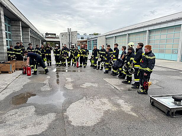 Nach einer kurzen Pause und Versorgung durch das Versorgungsteam folgten vorwiegend praktische Übungen im Stationsbetrieb. Kleinlöschgeräte, wie etwa verschiedene Feuerlöschertypen und deren Anwendungsbereiche, wurden am Fire Trainer beübt. Ebenso wurde der Umgang mit tragbaren Leitern anhand einer zweiteiligen Schiebeleiter trainiert. Hierbei stand neben der Vorgehensweise und dem Kommandieren der Mannschaft beziehungsweise dem Anleitervorgang selbst, vor allem die Eigensicherung beim Besteigen und Arbeiten auf Leitern im Vordergrund.