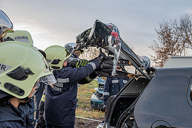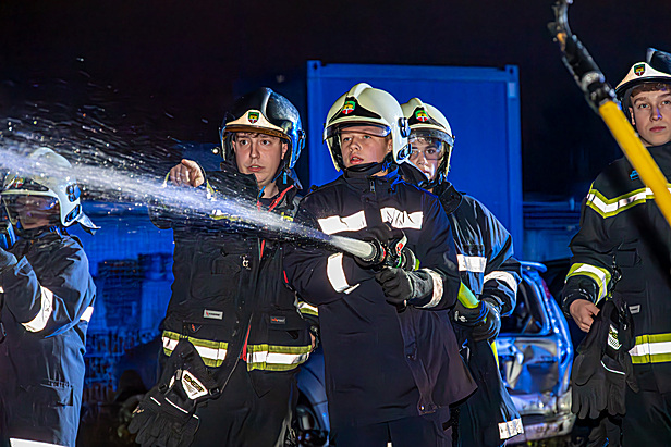 Auch in der Nacht blieb es realistisch: Eine ausgelöste Brandmeldeanlage im Feuerwehrhaus weckte die Teilnehmer, bevor am nächsten Morgen eine Ausbildungseinheit zur Menschenrettung aus einem PKW folgte.