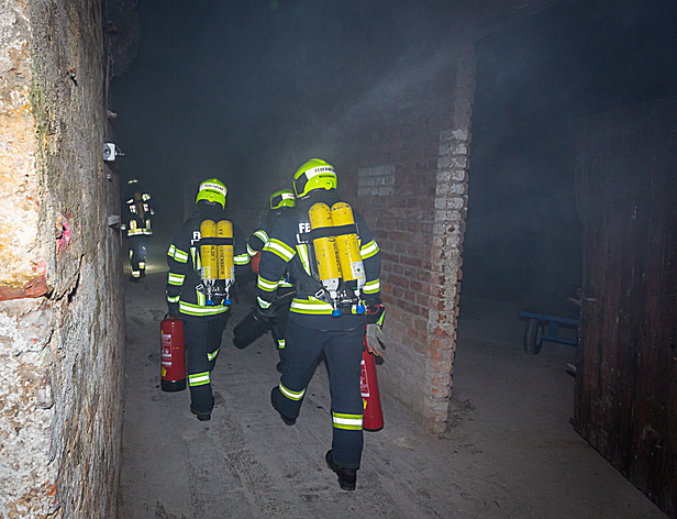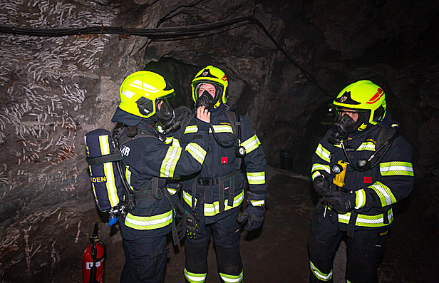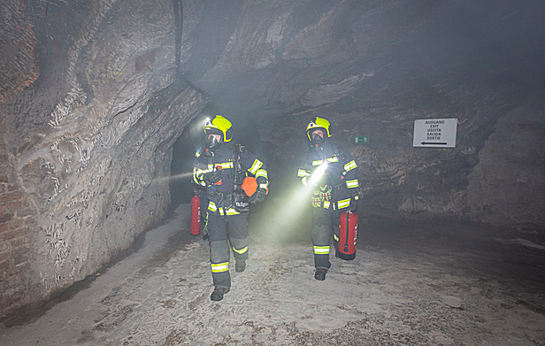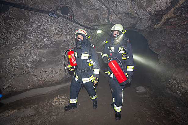 Die Freiwilligen Feuerwehren schickten umgehend mehrere Atemschutztrupps über den Hauteingang sowie über den ehemaligen Förderturm in das aufgelassene Gipsbergwerk. Nach einem rund 300 Meter langen Anmarsch mussten die Trupps an der Rauchgrenze ihre Suche beginnen: Mit Wärmebildkameras wurden bei geringer Sicht und starker Verrauchung alle Seitenstollen der Sohle kontrolliert. Der eine Ebene darunter liegende unterirdische See mit Booten für Rundfahrten war vom Brand nicht betroffen. Ein Atemschutztrupp fand schließlich im Bereich einer Werkstätte verschmorte Akkus von Werkzeugen. Die Batterien wurden abgelöscht und in Wasserkübeln ins Freie gebracht.