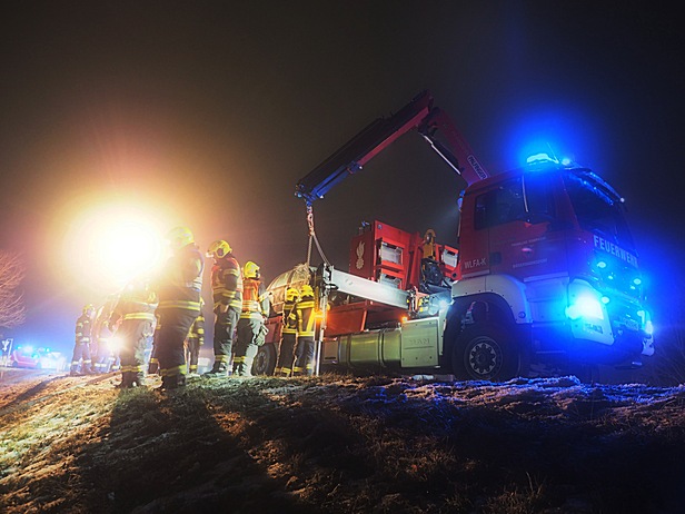 Von den Feuerwehrkräften wurde der PKW mittels Kran des Wechselladerfahrzeuges geborgen und abtransportiert. Die Feuerwehr Biedemrnansdorf stand mit mehreren Fahrzeugen über eine Stunde im Einsatz.