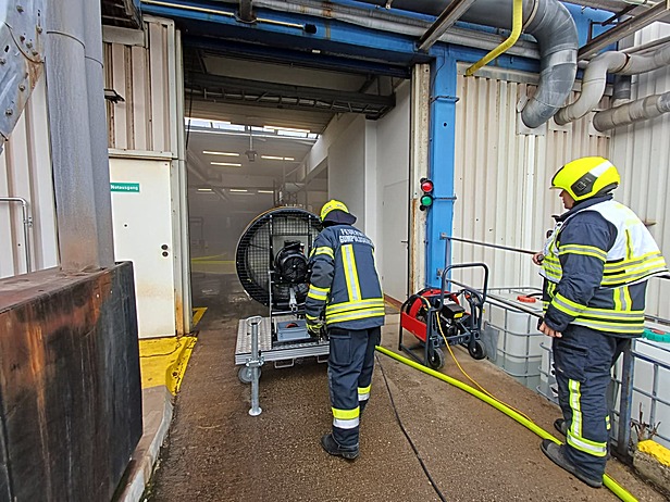 Der Atemschutztrupp ging mit einer C-Löschleitung vor. Mittels Sprühstrahl konnten die entstandenen Dämpfe niedergeschlagen werden. Zeitgleich kamen mehrere Belüftungsgeräte zum Einsatz. Nach kurzer Zeit zeigten die gesetzten Maßnahmen Wirkung. Der ebenfalls eingetroffene Schadstoffberatungsdienst kontrollierte gemeinsam mit der Firmenleitung die betroffene Halle und konnte eine weitere Gefährdung ausschließen.