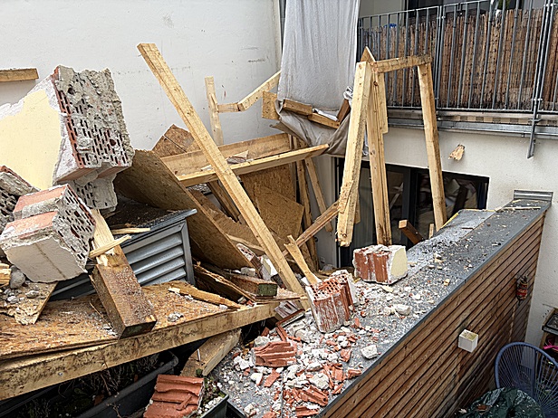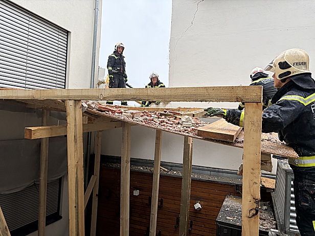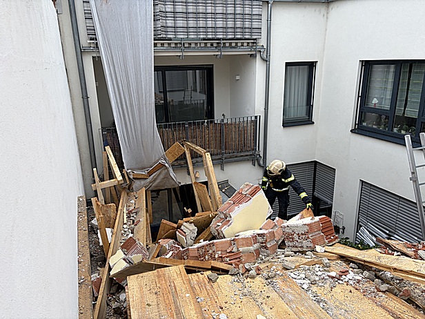 Am Einsatzort war nach der ersten Lageerkundung schnell klar, dass im Zuge von Abbrucharbeiten mehrere Mauerteile in einen benachbarten Innenhof gestürzt sind und das dort errichtete Schutzgerüst teilweise zerstört haben. Glücklicherweise wurden bei diesem Vorfall keine Personen verletzt oder verschüttet.