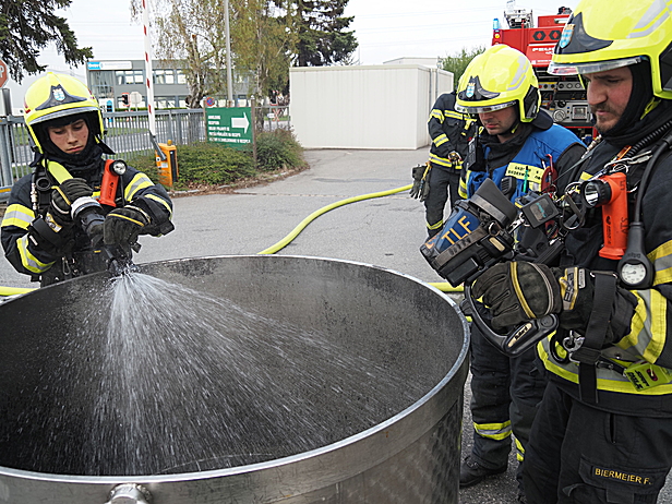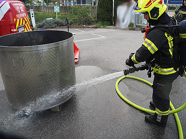 Bei der Erkundung an der Einsatzstelle stellte der Einsatzleiter fest, dass es im Zuge von Revisionsarbeiten an einem Produktionsbehälter zu einem Brand des Inhalts gekommen war. Das Feuer konnte bereits vor dem Eintreffen der Feuerwehr durch einen Mitarbeiter mithilfe eines Feuerlöschers erfolgreich gelöscht werden.