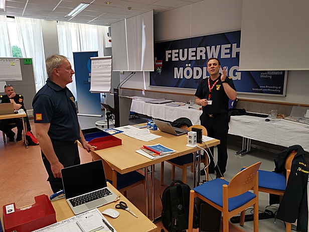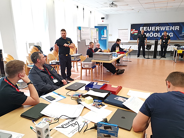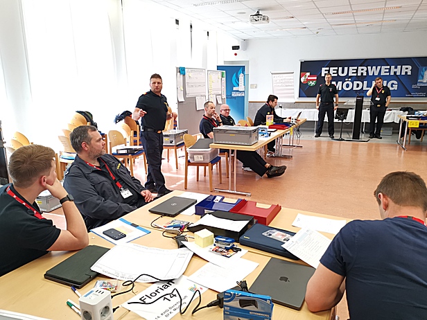 Am zweiten Tag folgte eine umfassende praktische Übung im Lehrsaal der FF Mödling. Dabei wurde ein vollständiger Führungsstab mit allen Sachgebieten aufgebaut und die grundlegenden Abläufe realitätsnah durchgespielt. Eingehende Meldungen wurden aufgenommen, im Stab verarbeitet und daraus entsprechende Entscheidungen abgeleitet. Anschließend wurden Befehle und Meldungen wieder aus dem Stab herausgegeben.