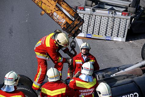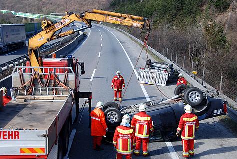 Durch das hohe Gewicht der Baggerlöffel und der Pendelbewegung des Anhängers wurde das Fahrzeug des Lenkers aus der Kontrolle gebracht und umgeschmissen. Der PKW kam am Dach liegend auf der ersten Spur zum Stillstand.
