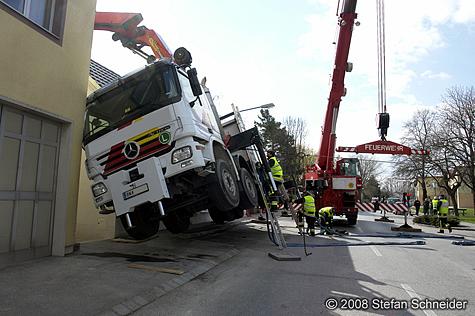 Mittels der Seilwinde des RLF-Tribuswinkel wurde gemeinsam mit dem Kranfahrzeug der verunfallte LKW wieder auf die Räder gestellt. Während der Bergungsarbeiten wurde der Ladekran des LKW aus eigener Kraft eingefahren, damit keine weiteren Schäden am Haus entstehen konnten.