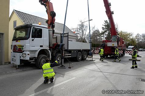 Nach Rücksprache mit dem Besitzer des LKW wurde um 8:57 Uhr das Kranfahrzeug zur Bergung des 4-Achs-LKW alarmiert.