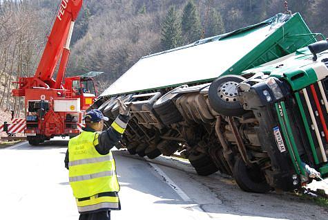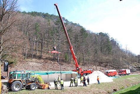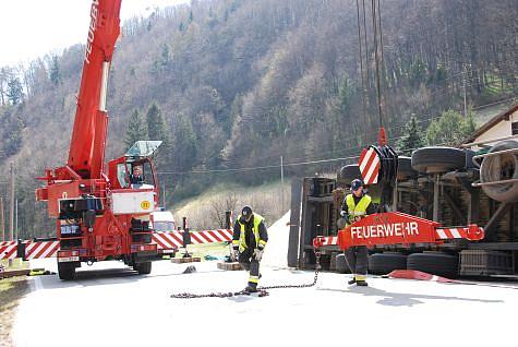 Unverzüglich setzten sich die Kameraden der Freiwilligen Feuerwehr Mödling mit dem Kran- und Wechselladefahrzeug in Bewegung. Am Unfallort angekommen, wurde nach der Lageerkundung durch den Kraneinsatzleiter LM Michael Schula entschlossen, den verunfallten LKW-Zug am Anhänger kurz anzuheben damit die Hebebänder in Stellung gebracht werden können.