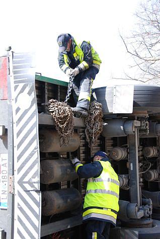 Die angeschlagenen Kettenstränge wurden abermals an der Lasttraverse angebracht. Zur Sicherung gegen ein eventuelles abrollen des LKW wurde das RLF Nöstach mit der Seilwinde in Stellung gebracht.