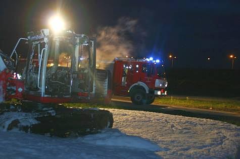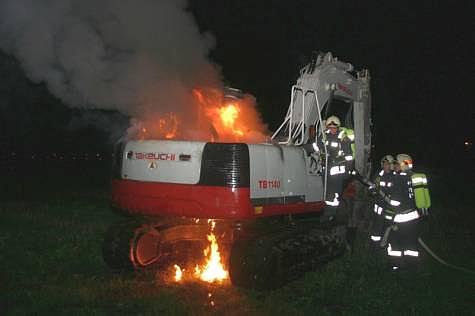 Schön während der Anfahrt zum Einsatzort war der helle Lichtschein des Brandes zu sehen. Unbekannte Täter setzten aus bislang unbekannter Ursache einen Löffelbagger an einer Baustelle nähe dem Kreisverkehr Schönbrunner Allee – Vösendorfer Nordspange in Brand. Binnen kürzester Zeit rückten die Einsatzkräfte der Feuerwehr Vösendorf zur Einsatzstelle aus.