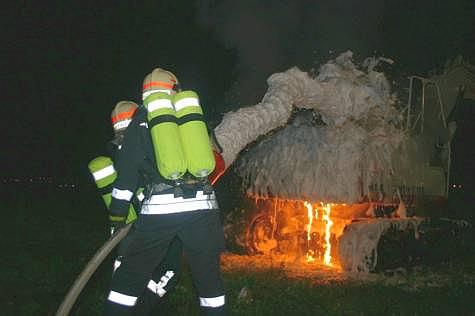 Beim Eintreffen der Feuerwehr Vösendorf stand der Bagger bereits in Vollbrand. Der während der Fahrt ausgerüstete Atemschutztrupp begab sich unverzüglich mittels Mittelschaumrohr zum Brandobjekt vor. Die Löschmaßnahmen zeigten sofort ihre Wirkung und der Brand konnte schnell unter Kontrolle gebracht werden.