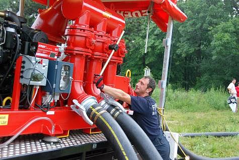 Nach dem Verlegen von einer Doppelleitung mit A-Druckschläuchen auf einer Länge von ca. 200 m wurde die Hochleistungspumpe beim mittleren Teich in Stellung gebracht.