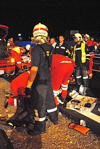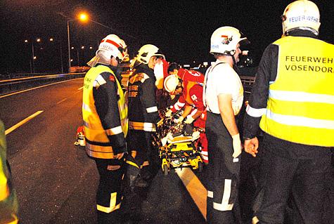 Zeitgleich mit dem Roten Kreuz traf das Vorausfahrzeug der Feuerwehr Vösendorf ein. Auf der Fahrbahn der Autobahn lagen drei junge Personen schwerst verletzt und wurden sofort von den Notarztbesatzungen aus Mödling und Baden erstversorgt.