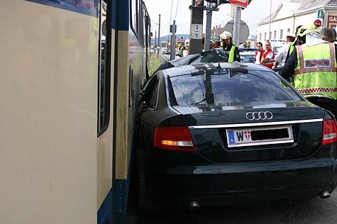 Der Lenker wollte mit seinem PKW auf eine Baustelle welche unmittelbar an der Bundesstraße liegt zufahren und war nach dem Zusammenprall zwischen dem Zug der Badner Bahn und der Leitschiene eingeklemmt.