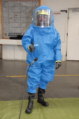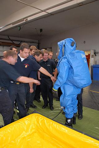 Nach einer theoretischen Schulung durch FT Ing. Michael Bruckmüller (FF Breitenfurt) wurde im Anschluß durch V Christian Vlach (FF Perchtoldsdorf) die neue WUS/DEKO Einheit (Wechsellader Umweltschutz/Dekontamination) präsentiert.