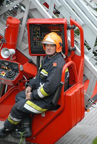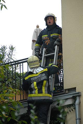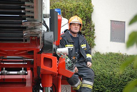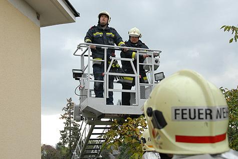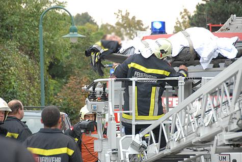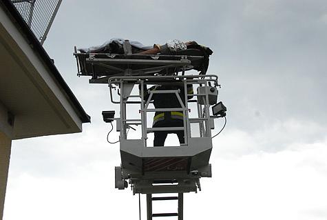 Unmittelbar danach traf die Drehleiter - mit Einsatzleiter HBI Wilhelm Nigl - ein und wurde mit der Rettungstrage in Stellung gebracht.