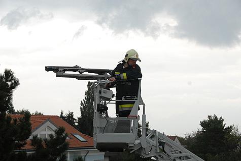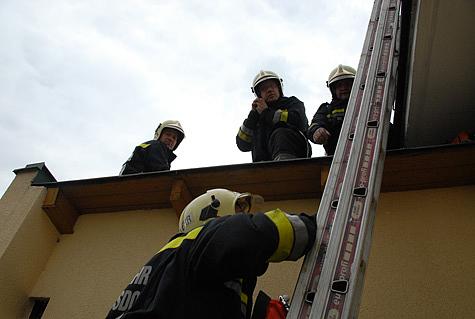 Um 15 Uhr 33 kam das 2. RLF Perchtoldsdorf an der Einsatzstelle an und die Feuerwehrmänner stiegen zu der verunfallten Person auf das Dach.