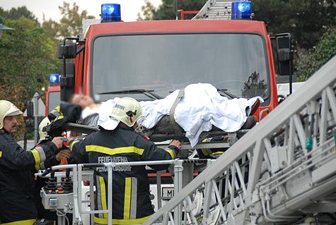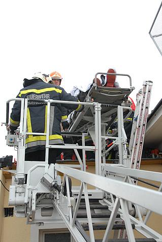 Nach der Erstversorgung durch die Notärztin des NAW Mödling wurde der Bursche auf die Krankentrage gehoben und mittels der Drehleiter vom Dach heruntergehoben.