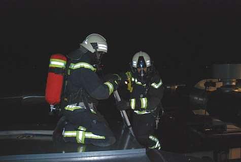 Ein Atemschutztrupp der Feuerwehr Wiener Neudorf begab sich über eine Gebäudeleiter auf die Höhe des Brandes. Anschließend wurde ein C-Strahlrohr zum Trupp aufgezogen ehe dieser mit den ersten Löscharbeiten beginnen konnte.