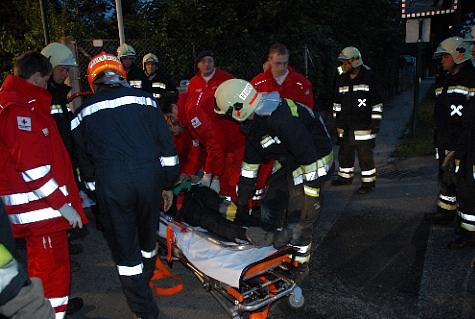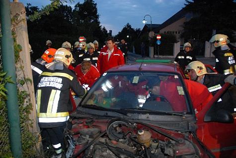 Nachdem der Notarzt aus Mödling am Einsatzort eingetroffen war wurde dem Verletzten ein spezielles Stützkorsett angelegt um die Wirbelsäule zu entlasten. Mit der Seilwinde des Rüstlöschfahrzeuges wurde der Unfall-PKW so aus dem Grundstück gezogen, dass eine Rettung durch die Beifahrertüre möglich war.