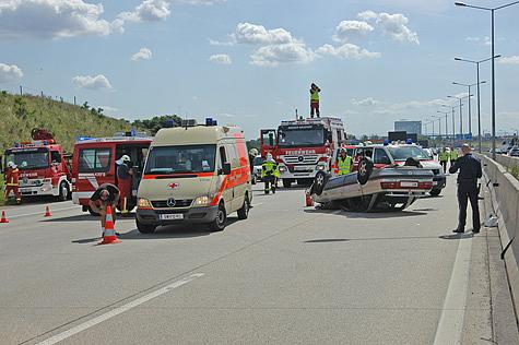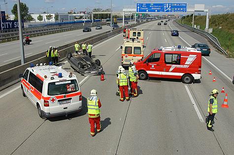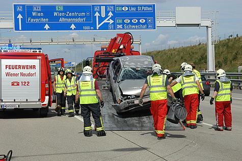Am 30. August 2009 um 13 Uhr 20 wurde die Freiwillige Feuerwehr Wr. Neudorf zu einem schweren Verkehrsunfall mit eingeklemmter Person gerufen. Auf der Autobahn A2, Fahrtrichtung Wien kam ein PKW aus ungeklärter Ursache auf Höhe der SCS ins Schleudern und krachte in die Betonleitwand. Durch den heftigen Aufprall wurde das Fahrzeug auf das Dach geworfen und schlitterte noch einige Meter über die Fahrbahn bis es zum Stillstand kam.