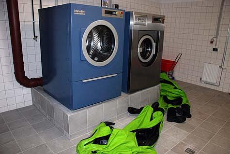 Der „Deko-Bereich“ für die Mannschaft ist sehr großzügig angelegt. Ein direkter Wäscheabwurfschacht in den Keller, Duschen, verschiedene Handwaschmittel, eine Industriewaschmaschine, ein Großtrockner und eine Umziehgarderobe mit Frischwäsche sind nur die wichtigsten Eckdaten dieses Bereiches. Ebenfalls sehr durchdacht ist die Atemschutzwerkstatt mit einer eigenen Schmutzwasserableitung in die Kellertanks bei Reinigung von gebrauchtem Einsatzmaterial.