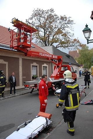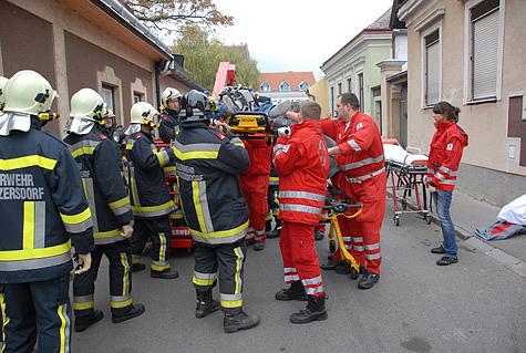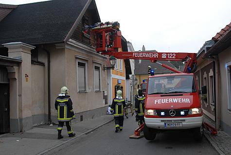 Das Unglück passierte im ersten Stock eines alten Hauses. Eine Rettung der Person durch das Stiegenhaus war unmöglich. Daher wurde um 8 Uhr 47 die Freiwillige Feuerwehr Maria Enzersdorf mit dem Steig zur Menschenrettung alarmiert. Unverzüglich setzten sich die ersten Einsatzkräfte in Bewegung.
