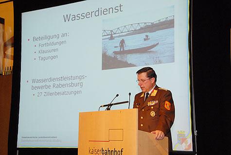 Bezirksfeuerwehrkommandant-Stellvertreter BR Ing. Richard Feischl präsentierte die Berichte der verschiedenen Sachgebiete. In der notwendigen Kürze wurde ein Auszug aus der beeindruckenden Bilanz der unzähligen Tätigkeiten dargelegt.