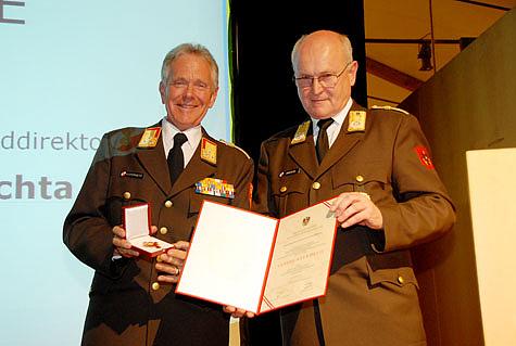 Anschließend erhielt ABI Paul Komucki von LFR Franz Koternetz eine Auszeichnung des Bezirksfeuerwehrkommandos Mödling.