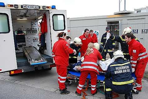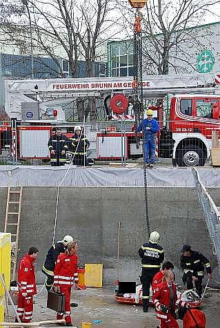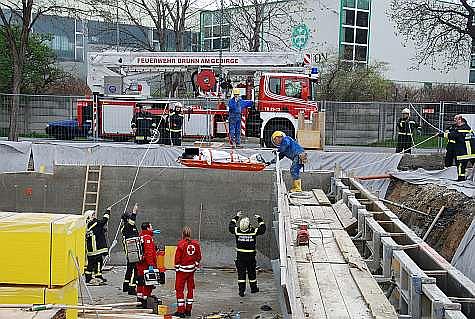 Die Bezirksalarmzentrale Mödling alarmierte um 12:39 Uhr die Freiwillige Feuerwehr Brunn am Gebirge zum Einsatz "Person in Notlage". Nachdem die verletzte Person durch das Rote Kreuz stabilisiert wurde, konnten die Einsatzkräfte den Bauarbeiter in die Korbrage der Hubrettungsbühne der Feuerwehr Brunn legen.