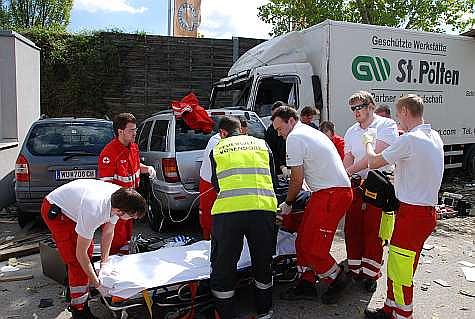 Ein 18t LKW war gerade in Fahrtrichtung Wien unterwegs als der Lenker plötzlich über die Gegenfahrspur lenkte, die Lärmschutzwand der B17 durchbrach und schließlich am Parkplatz des Tierschutzhauses Vösendorf zum Stillstand kam. Durch die extreme Wucht des Aufpralles wurde der Lenker im Führerhaus im Beinbereich eingeklemmt.