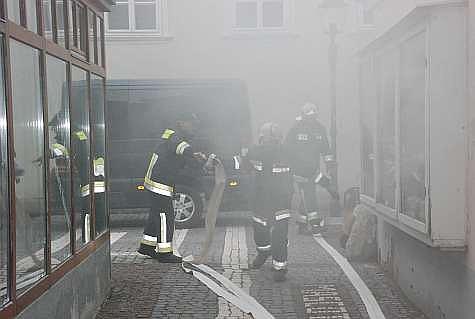Beim Eintreffen des ersten Löschfahrzeuges drangen bereits dichte Rauchwolken aus dem Geschäft. Umgehend begab sich ein Atemschutztrupp mit einem HD-Rohr ins Objekt vor.