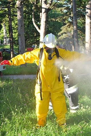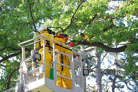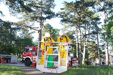 Mittels Schutzstufe 2 Anzügen unter Atemschutz begann ein Trupp mit einem Flämmgerät die Eichen-Prozessionsspinner vom Baum zu entfernen.