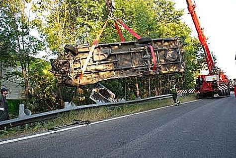 Nach dem Anbringen der Hebebänder wurde das Unfallfahrzeug auf die Fahrbahn gehoben, auf die Räder gestellt und anschließend entfernt.
