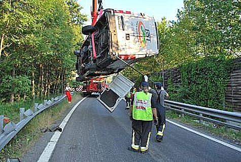 Umgestürzter Klein-LKW hängt über Leitschiene