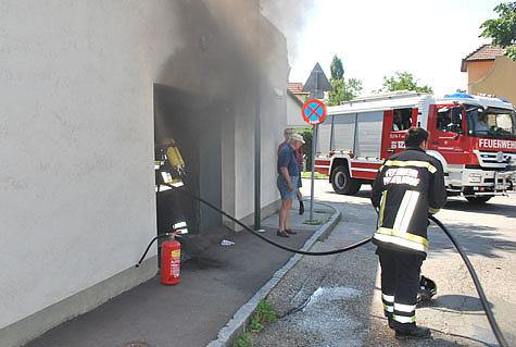 Ein Atemschutztrupp begab sich sofort mit einem HD Rohr in das Innere der Garage und begann mit den Löschmaßnahmen.