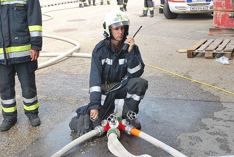 Nachfolgende Einsatzkräfte der FF Hennersdorf und Vösendorf rüsteten weitere Atemschutztrupps aus und stellten die Wasserversorgung über eine 240 Meter lange Zubringleitung sicher.