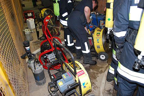Mit mehreren Hochleistungslüftern wurde die Halle mit Frischluft versorgt und die Kühlung unterstützt. Erst dann konnten die Atemschutztrupps zum Brandherd vordringen und das brennende Hydrauliköl mit Schaum ablöschen.