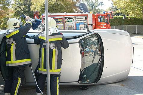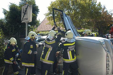 Mitten im Ortsgebiet von Maria Enzersdorf kam es am 21. August am Vormittag zu einem folgenschweren Verkehrsunfall. Auf der Kreuzung Johannesstrasse mit der Hofgasse wurde ein PKW von einem linkskommenden Fahrzeug gerammt. Die Wucht des Aufpralls war so groß, dass der betroffene PKW ausgehoben wurde und auf der Beifahrerseite zu liegen kam. Die Fahrertüre war durch die Deformation nicht mehr zu öffnen und der Fahrer im PKW eingeschlossen.