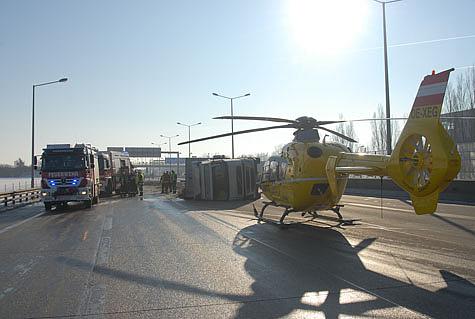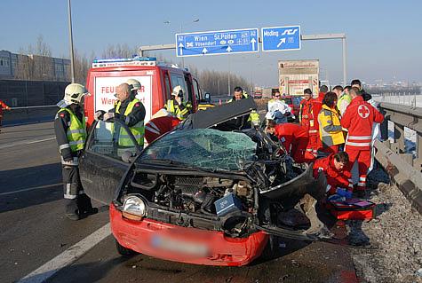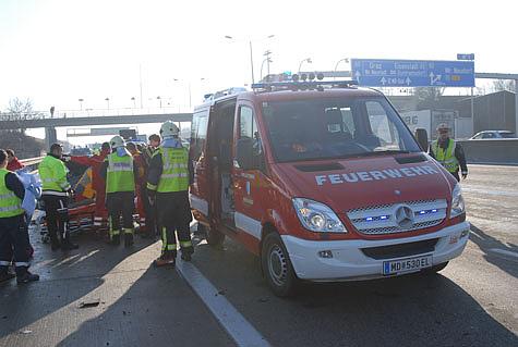 Das Vorausfahrzeug der FF Wiener Neudorf hielt bei dem ersten Unfallfahrzeug an und leistete sofort Erste Hilfe. Gemeinsam mit dem Eintreffen der Einsatzkräfte der FF Vösendorf, landete auch der Christophorus Hubschrauber auf der Autobahn. Das Vorausfahrzeug der FF Vösendorf fuhr einige hundert Meter weiter zu dem ungekippten Lkw und dem zweiten Unfallfahrzeug.
