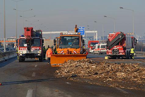 Nachdem alle Unfallbeteiligten erstversorgt waren, wurde mit den langwierigen Aufräumarbeiten begonnen. Zur Bergung des Lkws wurde das schwere Kranfahrzeug der FF Mödling alarmiert und gegen die Fahrrichtung auf die Autobahn gebracht. Außerdem wurden diverse Fahrzeuge der Stassenmeisterei angefordert um die Fahrbahn zu reinigen. Weiters wurde mit dem Last II der FF Wr. Neudorf ein Bagger zur Unfallstelle transportiert. Neben den Hackschnitzeln war die gesamte Fahrbahn über alle Spuren durch den ausgetretenen Dieselkraftstoff extrem rutschig.