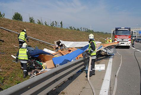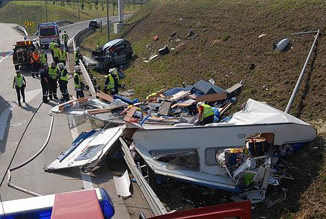 Die Feuerwehr baute sofort den Brandschutz auf und löschte den überhitzten Motorraum des Unfallfahrzeuges ab. Anschließend begannen die langwierigen Aufräumarbeiten - der Wohnwagen war völlig zerstört. Währenddessen musste eine Spur der Schnellstraße gesperrt werden.
