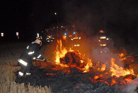 Aufgrund dessen, dass keine Gefahr für Menschen oder Sachgüter bestand, ließen die Feuerwehren den Brand unter Kontrolle ausbrennen. Mit Einreißhaken und Feuerpatschen wurde das brennende Stroh verteilt und kleinere Glutnester ausgeschlagen.
