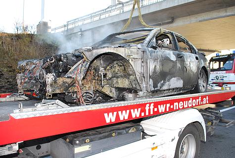 Um 12 Uhr 53 wurde die Freiwillige Feuerwehr Wiener Neudorf zum Brandeinsatz auf die Autobahn alarmiert. Der Einsatzort befand sich in Fahrtrichtung Wien bei der Rampe zur A 21 Außenringautobahn. Der PKW Lenker bemerkte während der Fahrt, dass unerwartet die Drehzahl seines Motors auf über 5000 Umdrehungen/min stieg. Er konnte gerade noch das Fahrzeug zum Stillstand bringen und zog den Startschlüssel ab. In diesem Moment schossen bereits Flammen aus dem Motorraum. Wenige Augenblicke später stand der PKW im Vollbrand. Nur kurze Zeit später rückte das erste Löschfahrzeug der Feuerwehr Wiener Neudorf zum Einsatzort aus. Bereits während der Anfahrt konnte aus weiter Entfernung eine große Rauchsäule wahrgenommen werden. Beim Eintreffen am Unfallort wurde sofort unter Atemschutz ein C-Rohr zur Brandbekämpfung in Stellung gebracht. Durch die extreme Flammenbildung griff das Feuer bereits auf die umliegende Wiesenböschung über. Durch das zweite Löschfahrzeug wurde ein weiteres C-Rohr zur Brandbekämpfung in Stellung gebracht. Binnen kürzester Zeit stellte sich der Löscherfolg ein und der Brand konnte unter Kontrolle gebracht werden. Die Ausfahrtsrampe von der A 2 auf die A 21 musste für die Dauer von 45 Minuten für den Verkehr komplett gesperrt werden. Das ausgebrannte Wrack wurde mittels Feuerwehrladekran von der Autobahn entfernt.Bildautor: Florian Schützenhofer/Pressestelle BFK Mödling