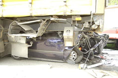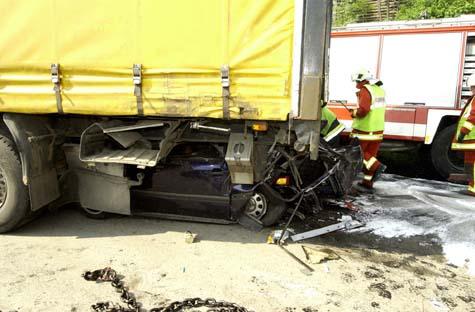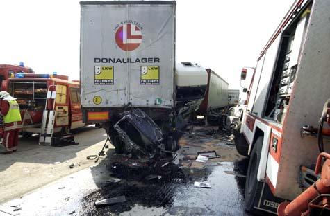 Ein Mercedes-Pkw wurde zur Seite geschleudert. Das zweite Fahrzeug, ein VW Golf, schob der auffahrende Lkw mit unvorstellbarer Wucht zur Gänze unter einen Sattelaufleger.