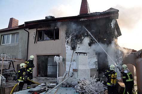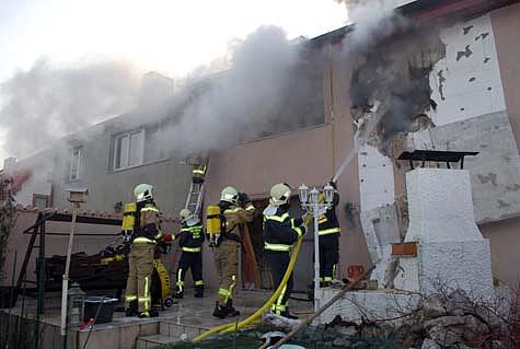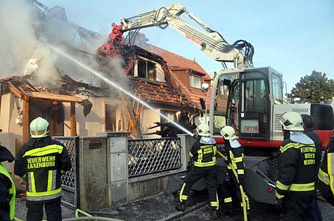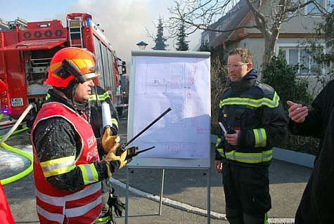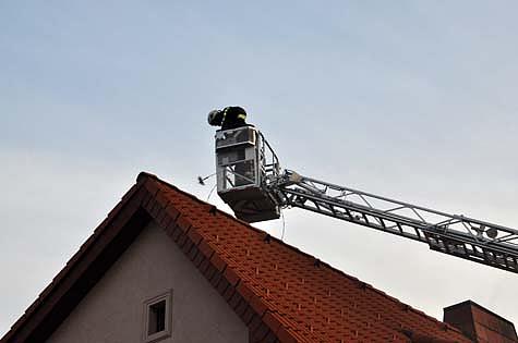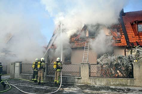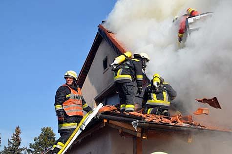 Als Erstmaßnahme wurden zwei Atemschutztrupps im Haus verteilt, um Wände und Decken des in Holzriegelbauweise errichteten Doppelhauses zu öffnen und den Brandherd zu lokalisieren.