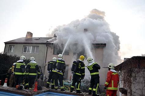 Inzwischen setzten die zwei eingesetzten Atemschutztrupps die Brandbekämpfung im Inneren des Hauses fort. Gleichzeitig wurde die Drehleiter Wiener Neudorf in Stellung gebracht, um mit einem Außenangriff im Bereich der Dachfläche beginnen zu können.