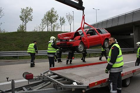 Nach Abtransport der Verletzten und abgeschlossener Unfallaufnahme der Polizei, konnte die Feuerwehr mit der Bergung des Fahrzeuges beginnen. Mit Hilfe des Ladekranes des schweren Rüstfahrzeuges wurde der PKW zurück auf die Fahrbahn gehoben und in weiterer Folge von der Autobahn abtransportiert.