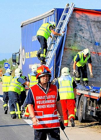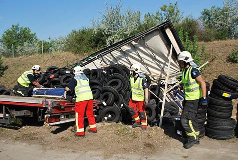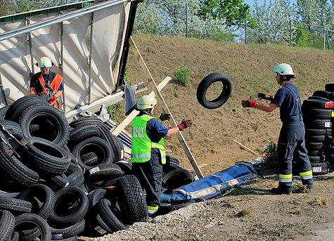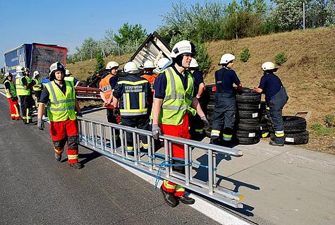Beim Eintreffen der Wiener Neudorfer Einsatzkräfte auf der A 2 erkannte die Einsatzleitung, dass das Entfernen und Entladen der zahlreichen Autoreifen einer größeren Mannschaftsstärke bedarf.